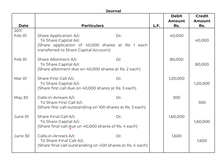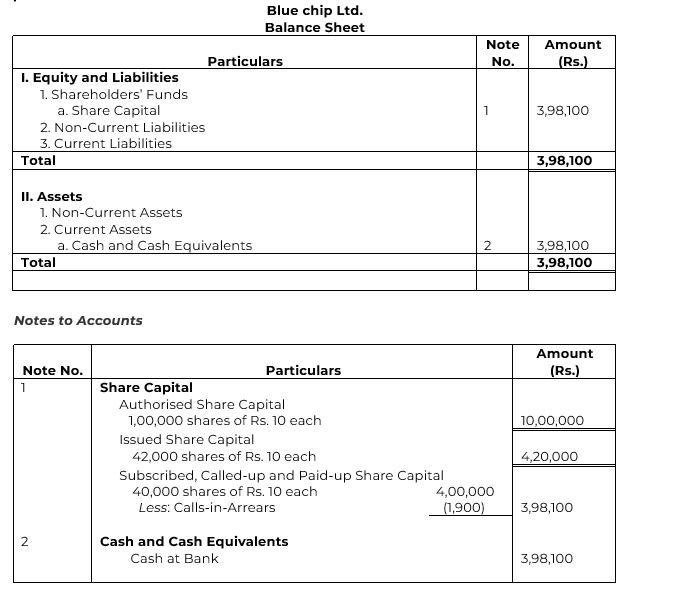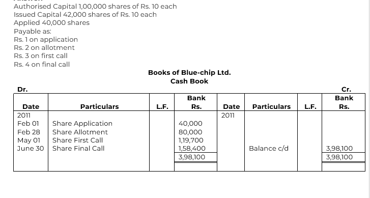 Blue chip Ltd. was registered on 1st January 2011 with a capital of Rs. 10,00,000 divided into 1,00,000 shares of Rs. 10 each. The company issued 42,000 shares of which 40,000 shares were taken up by the public and Rs. 1 per share was received with application. On 1st February, these shares were allotted and Rs. 2 per share was duly received on 28th February as allotment money. A first call of Rs. 3 per share was made on 1st March and the call money on all shares with the exception of 100 shares was received. The final call of Rs. 4 per share was made on 1st June and the amount due, with the exception of 400 shares, was received by 30th June. Pass necessary journal and Cash Book entries and prepare the Balance Sheet as at 30th June, 2011.
