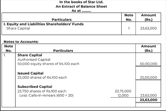 Star Ltd. is registered with capital of Rs. 50,00,000 divided into 50,000 equity shares of Rs. 100 each, The Company issued 25,000 equity shares for subscription. Subscription was received for 23,750 shares and all the due amount was duly received, except the first and final call of Rs. 20 per share on 600 shares. Show the ‘Share Capital’ in the Balance Sheet of the company