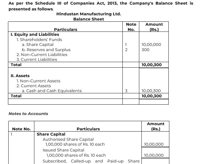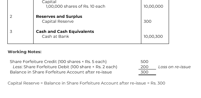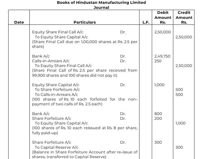 The Hindustan Manufacturing Ltd. had a total subscribed capital of Rs. 10,00,000 in Equity Shares of Rs. 10 each of which Rs. 7.50 were called-up. A final call of Rs. 2.50 was made and all amount paid except two calls of Rs. 2.50 each in respect of 100 shares held by D. These shares were forfeited and reissued at Rs. 8 per share. Pass necessary journal entries (including that of cash) to record the transactions of final call, forfeiture of shares and reissue of forfeited shares. Also, prepare the Balance Sheet of the company.
